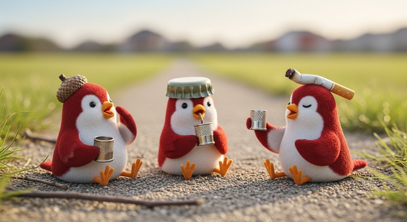 This image showcases a hyperrealistic, whimsical style, reminiscent of stop-motion animation or detailed felt craft. The medium appears to be digital rendering, meticulously mimicking tangible textures. The color palette is vibrant and warm, featuring rich reds and crisp whites against a soft, natural background of greens and muted browns.